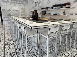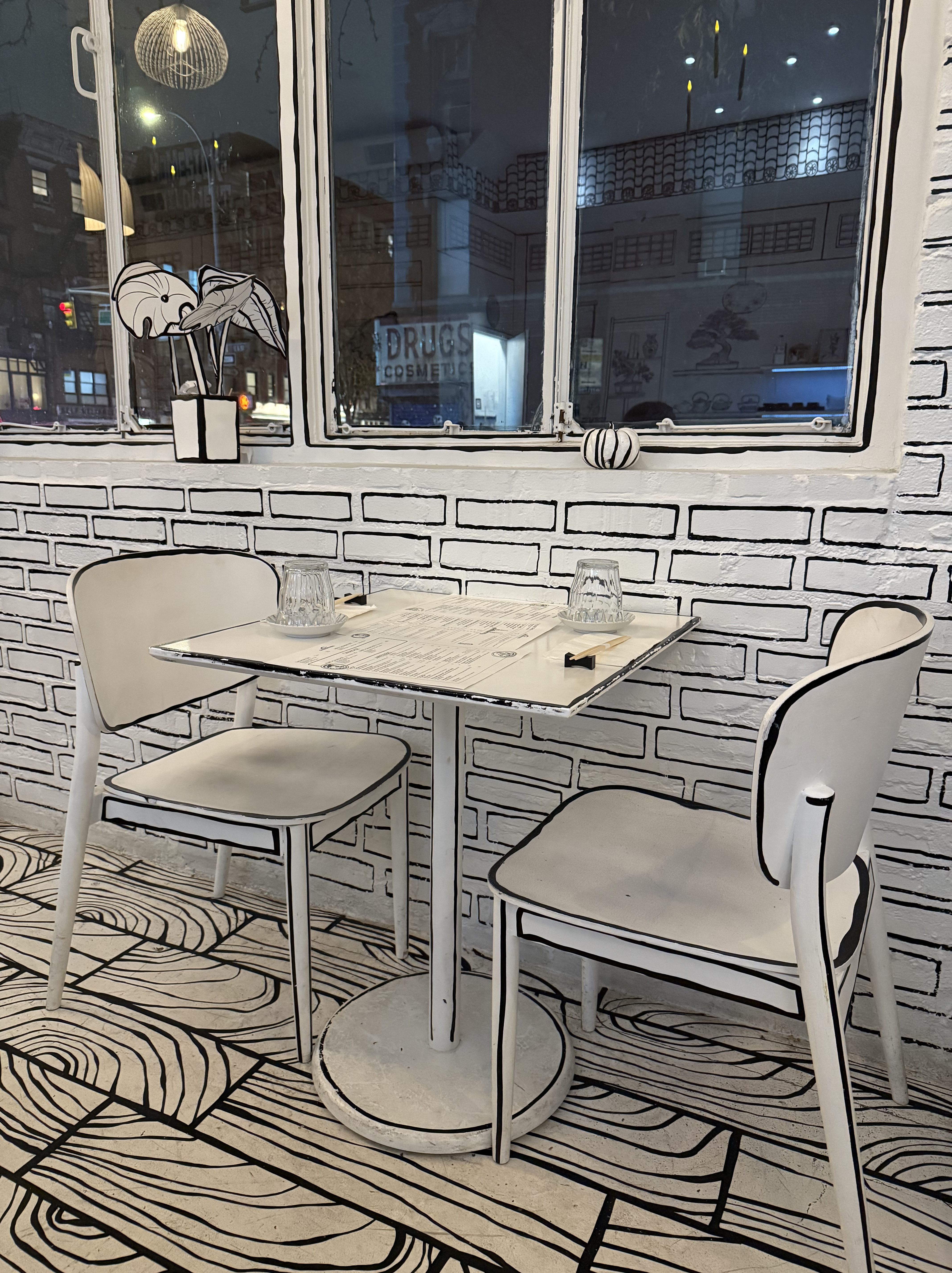 Entering Shirokuro on the lower east side of New York is like stepping into a two-dimensional, black-and-white drawing, with floors, ceilings, and furniture that all look like they’re straight out of a comic book. Even the bathrooms are on theme!