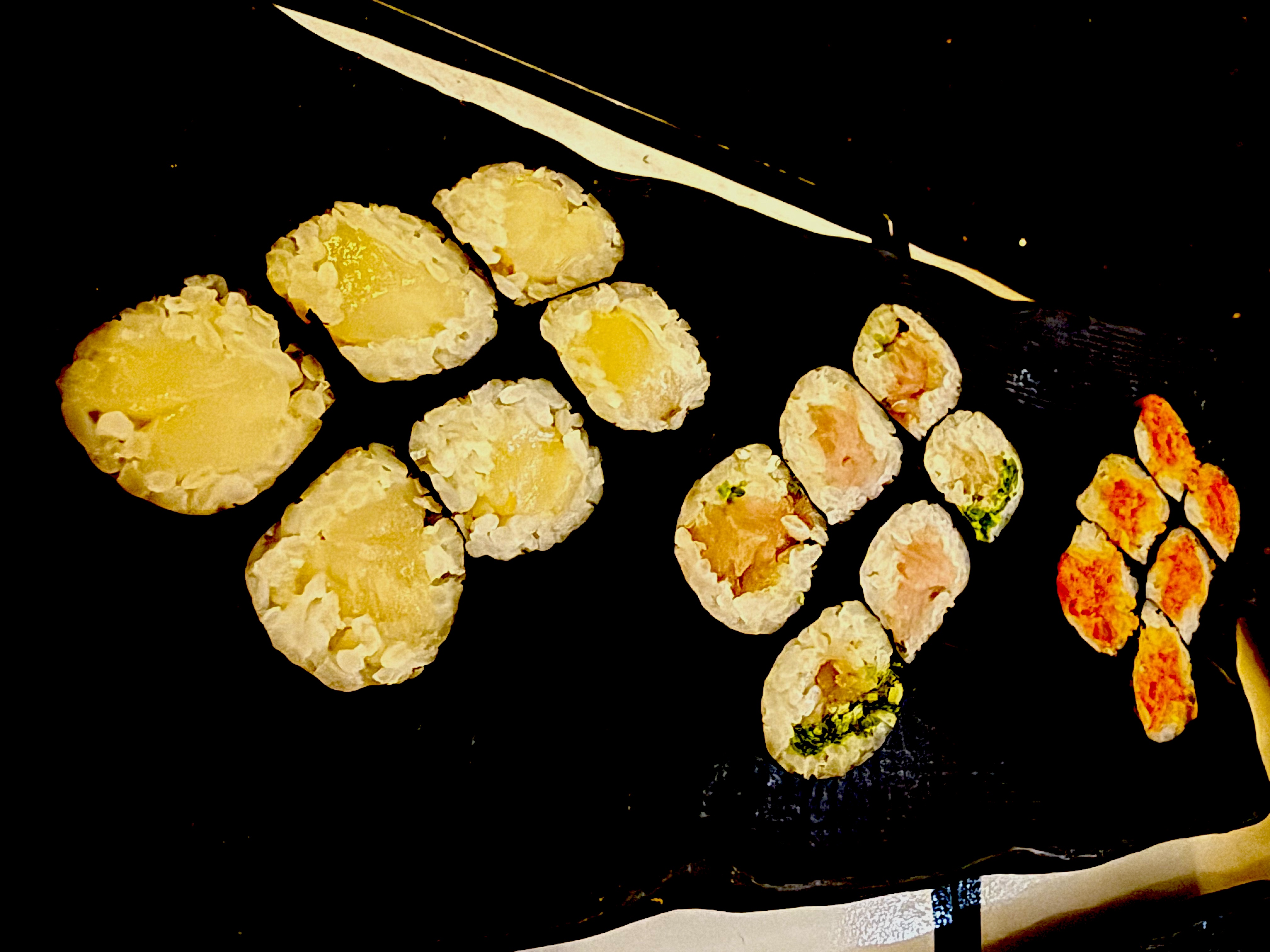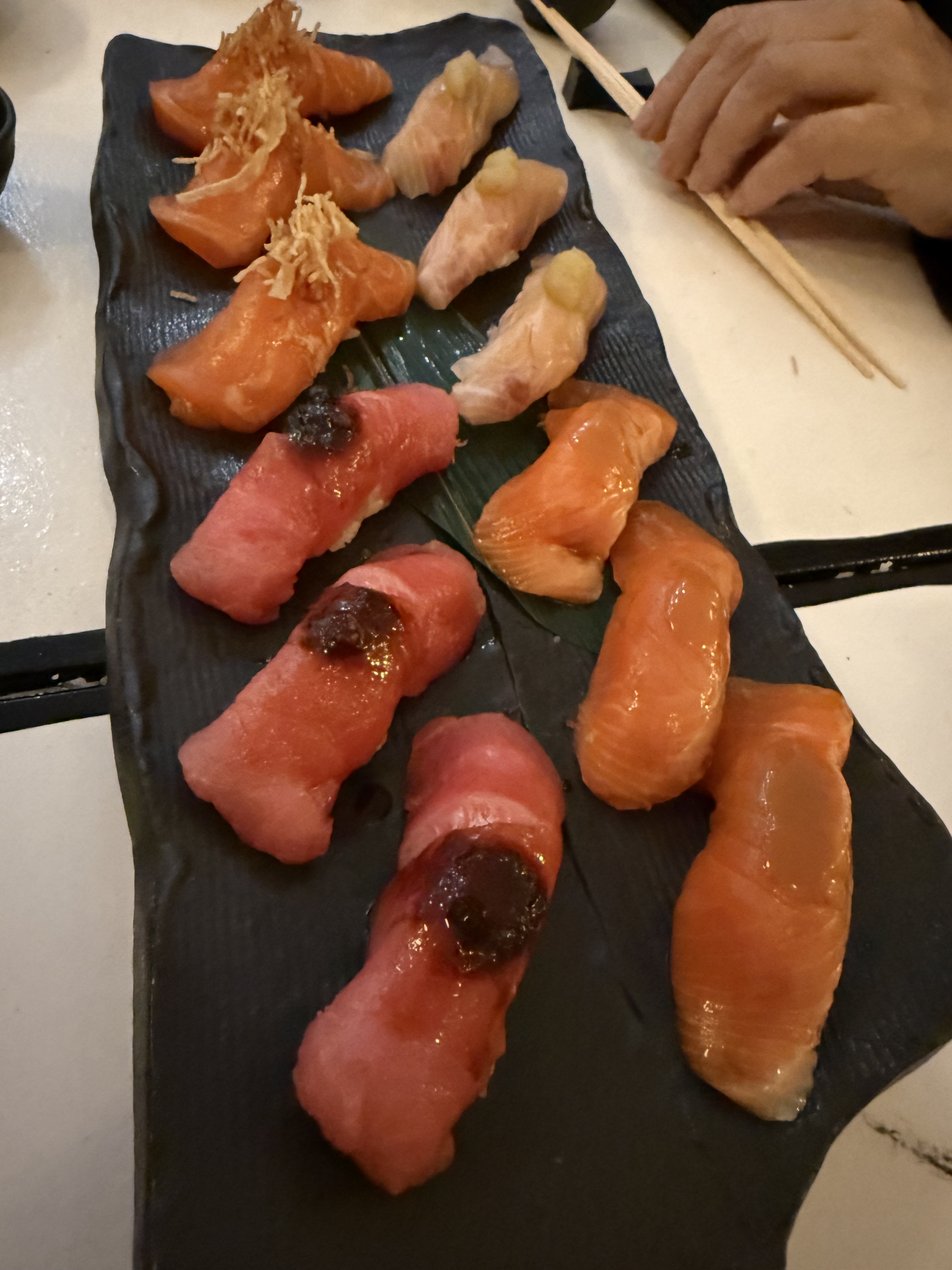 Yellowtail, spicy tuna and spicy salmon – all straightforward and tasty, well priced as well.