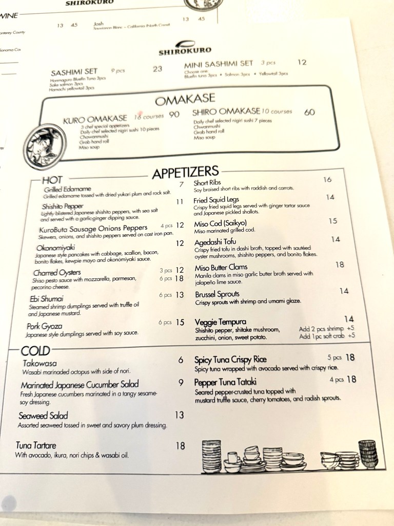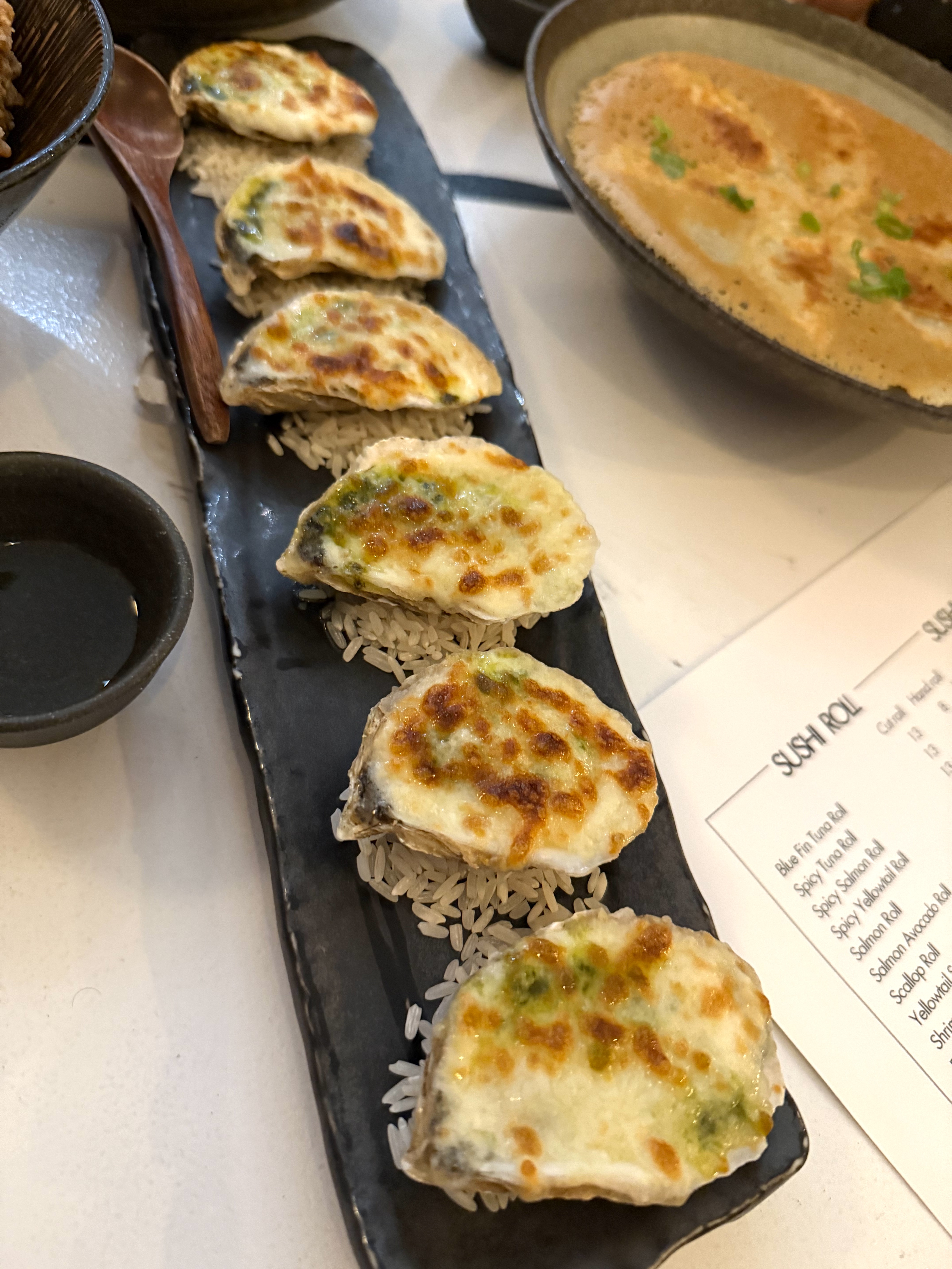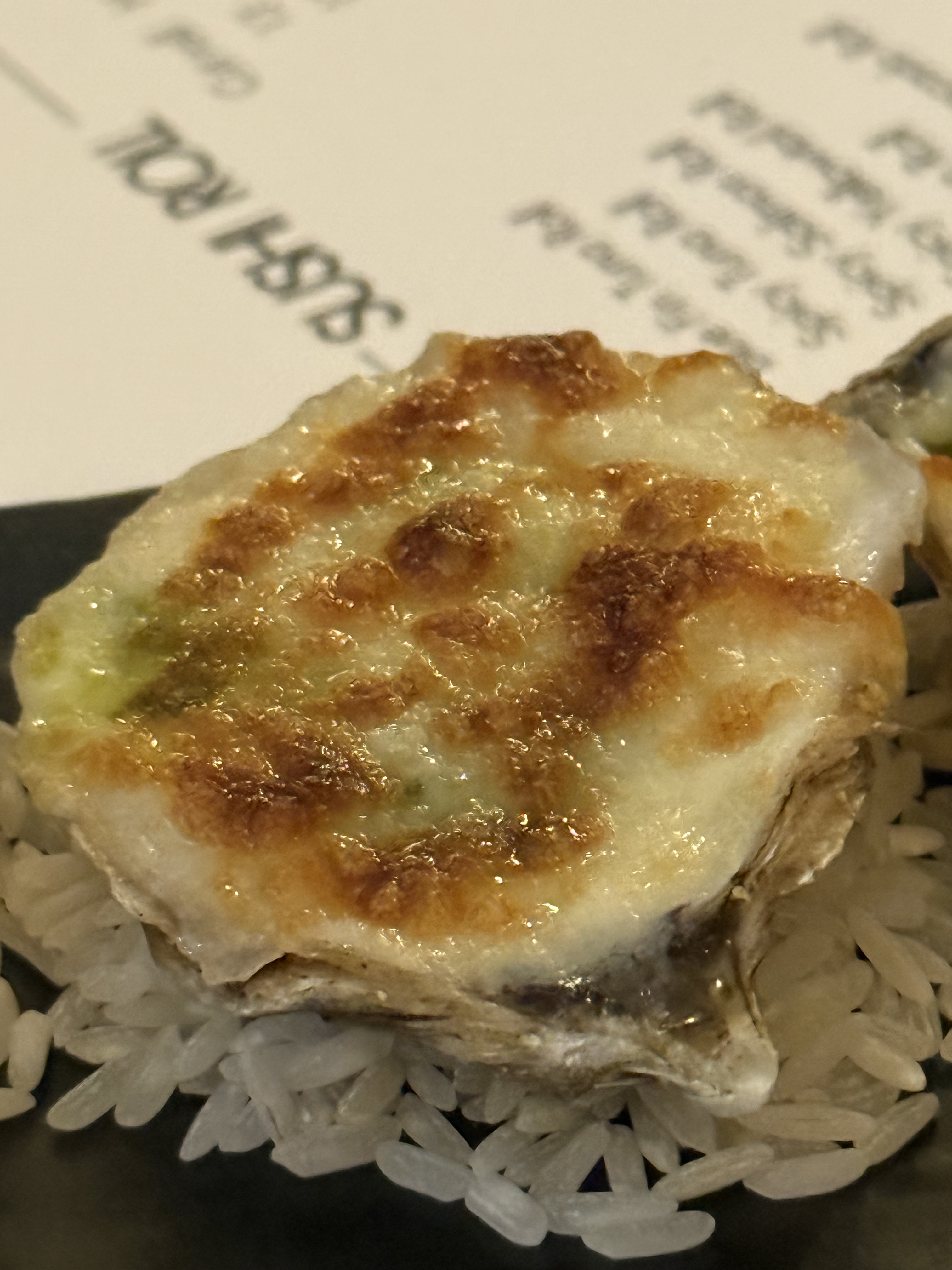 As you can see, it’s a traditional Japanese pub, with hot and cold appetizers and different varieties of sushi and sushi rolls on another page to order as well…we started with the charred oysters: