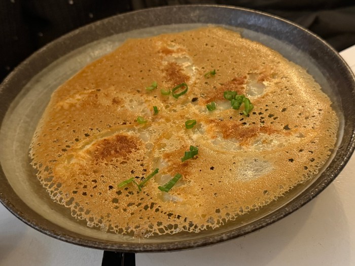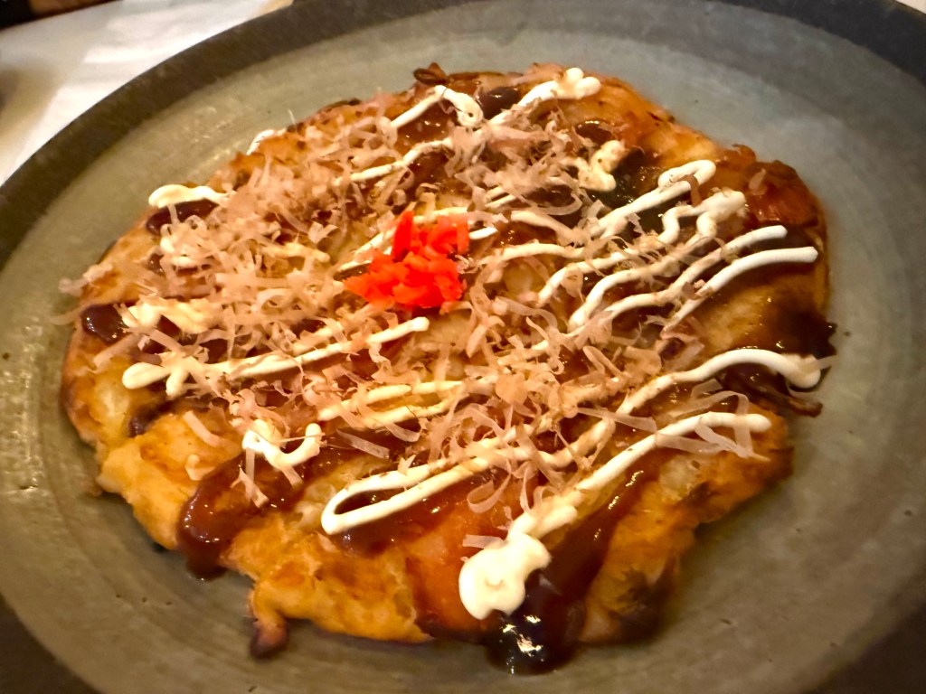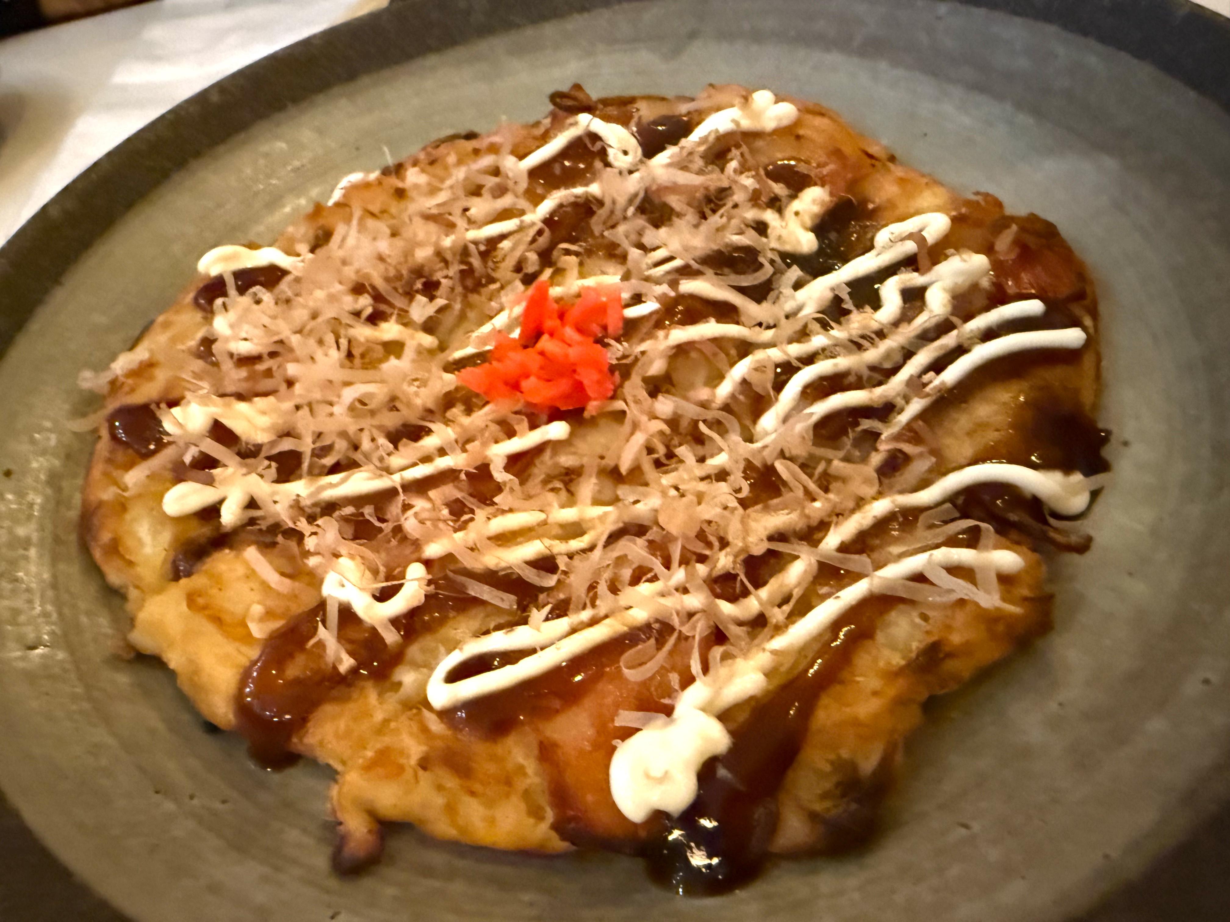 Next up was a favorite of mine: okonomiyaki – the griddled pancake stuffed with vegetables and covered with flavored mayos!
