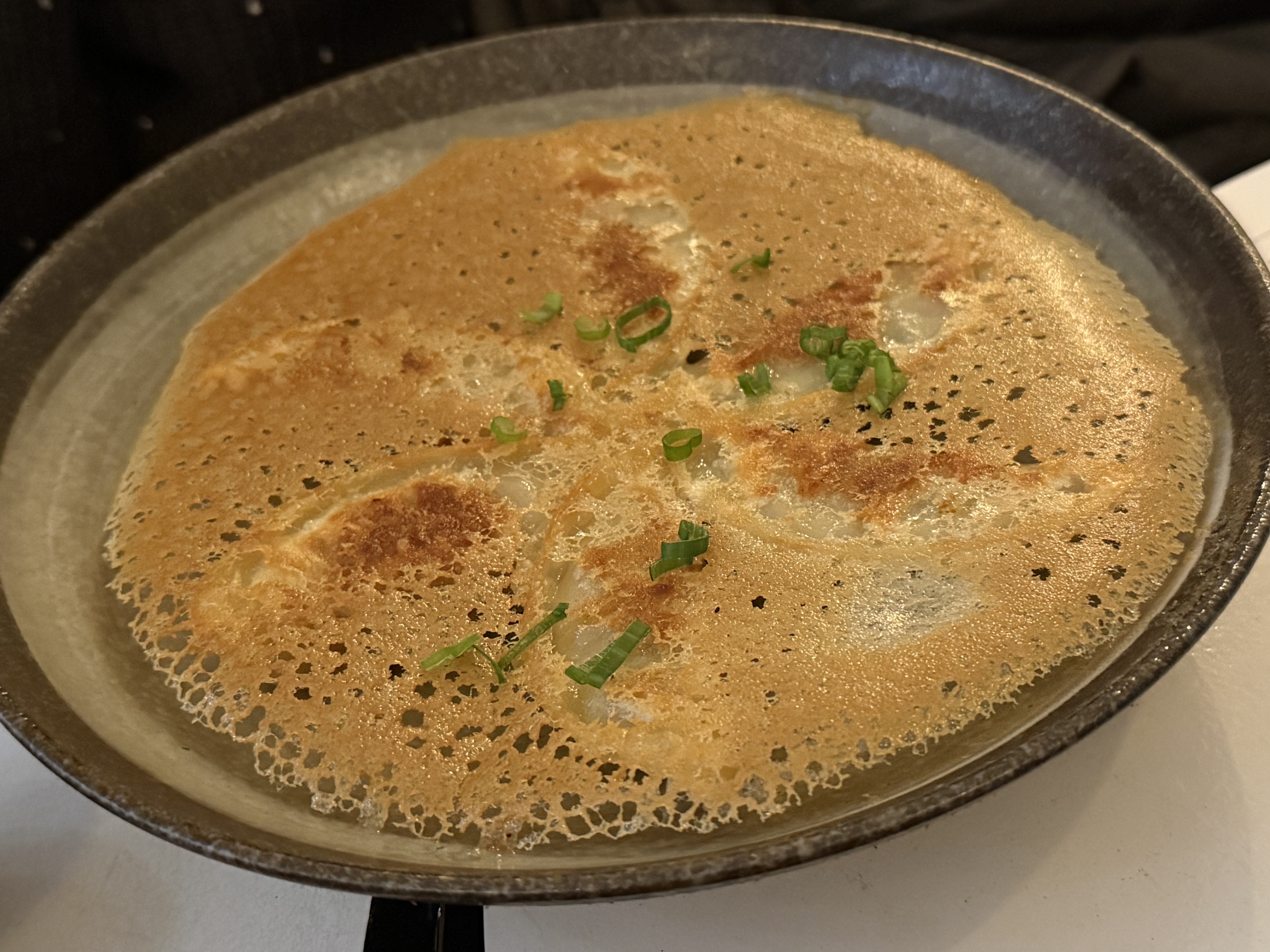 The potstickers are under this thin pancake-like crust! A fun crunch to add to the chewy potsticker!