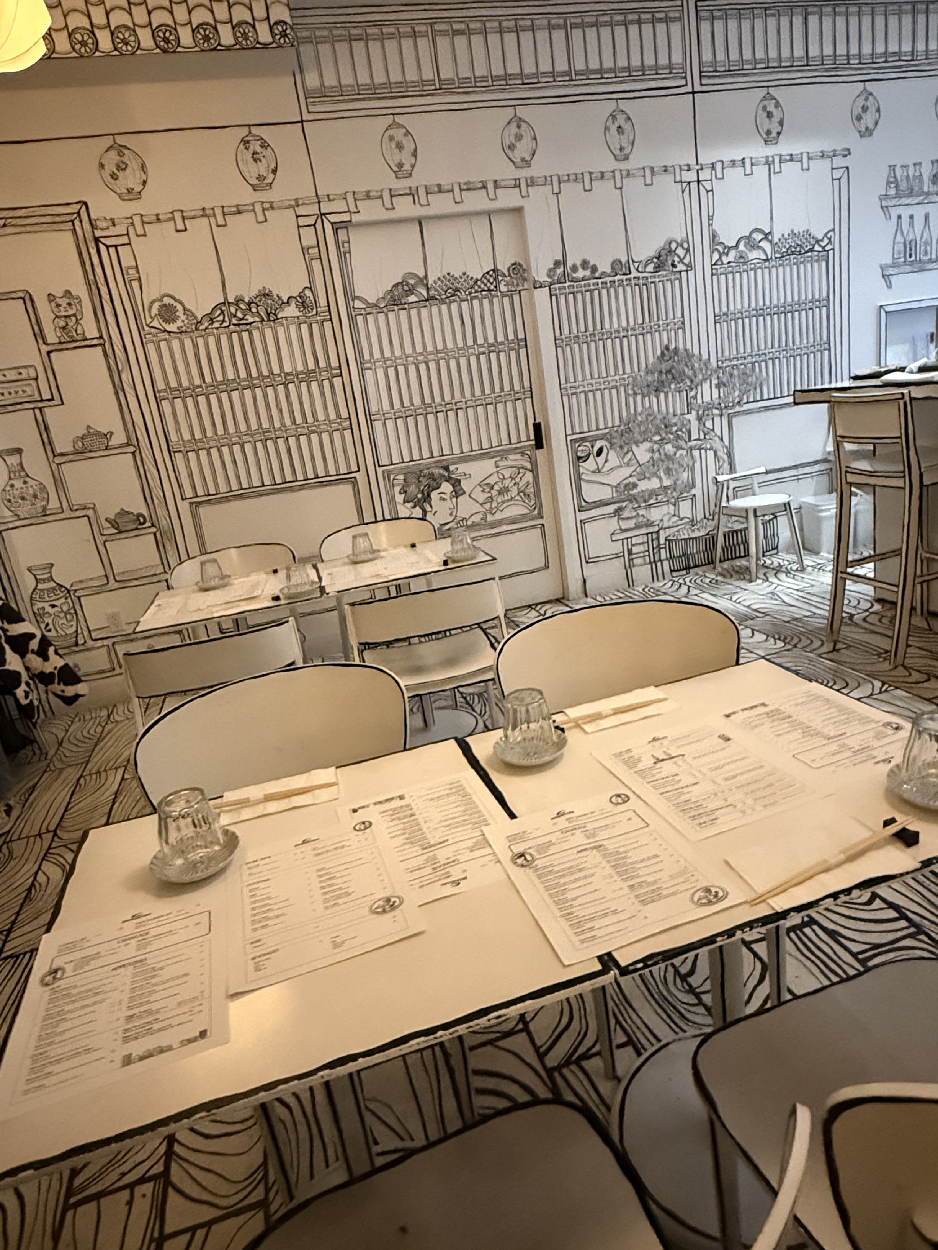 That’s the sushi counter, where almost every single thing is kept black and white! Every table was the same, a cool hand drawn look because they all were!