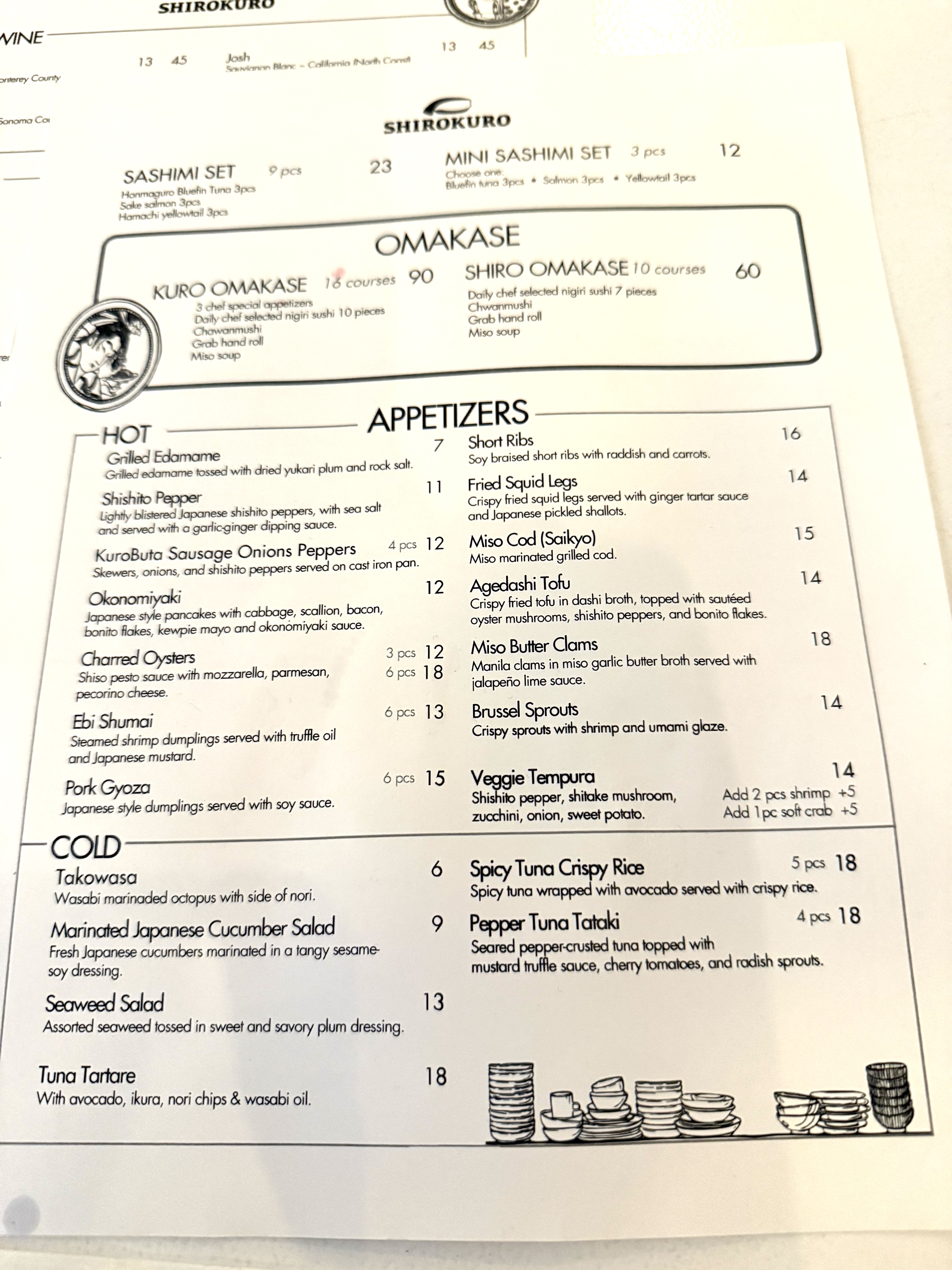 Shirokuro’s commitment is truly impressive. Its name actually means “white black” in Japanese, and you see it utilized everywhere, whether it’s the illustrated sake bottles lined up next to real ones behind the bar, or the delicate grain of the “wood” floorboards. It took the restaurant’s art director more than three months to hand-draw it all.
